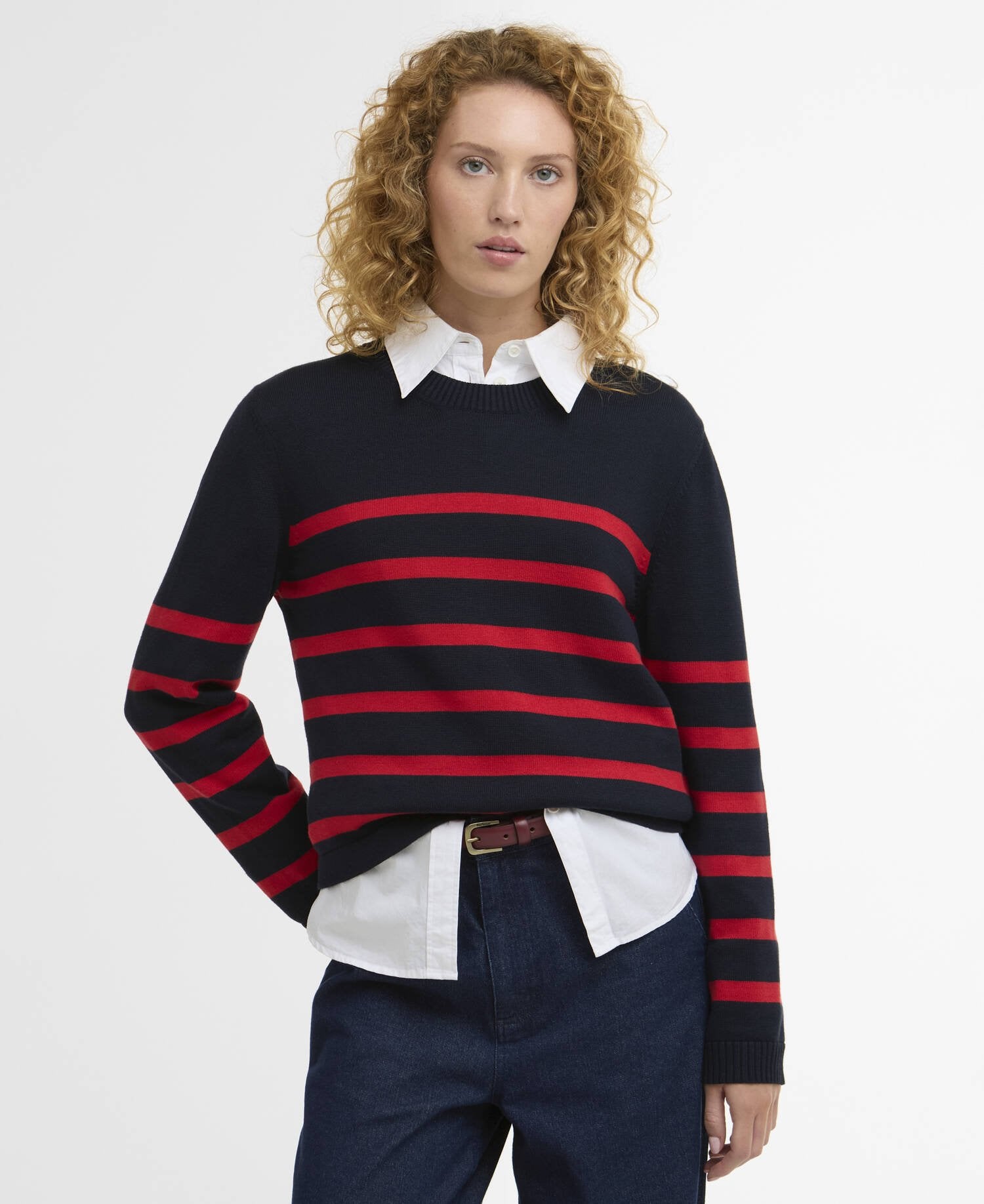 The Barbour Fern Striped Crew Neck Jumper is a contemporary take on classic knitwear. Crafted from soft cotton yarn, it features a slightly cropped body and relaxed sleeves for effortless comfort. A modern block design with a subtle placement stripe adds visual interest, while the slim metal ID bar at the back neck delivers a signature Barbour touch. Perfect for layering or wearing on its own, it combines style and versatility.