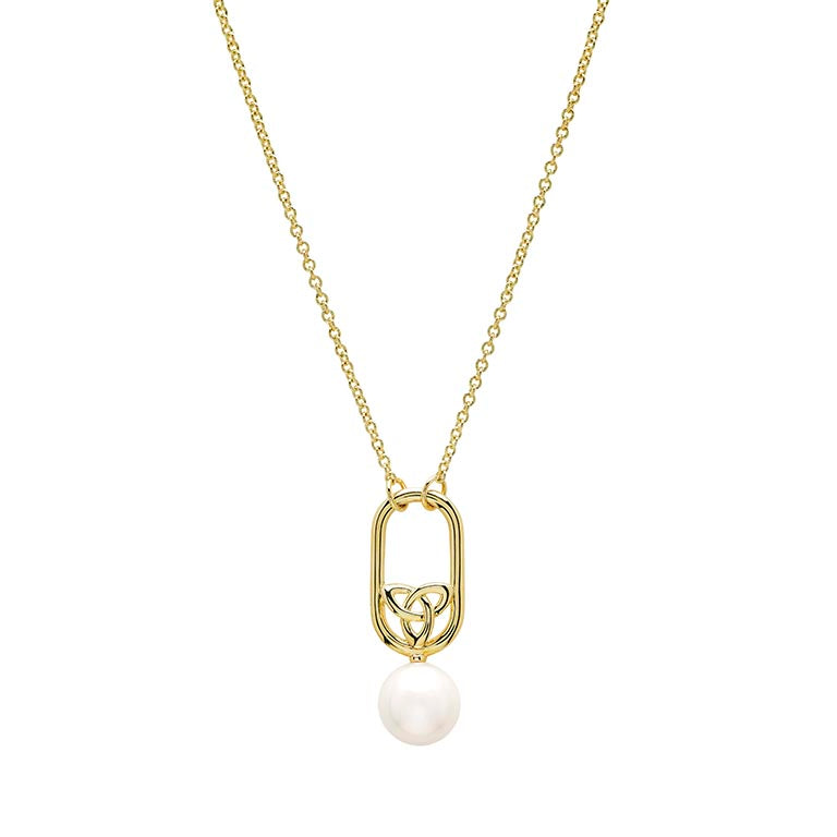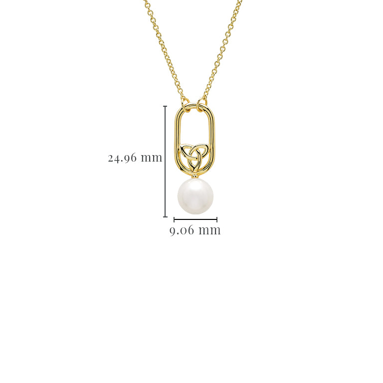 Feel joy flow into your heart wearing Shanore’s 14K Gold Vermeil Trinity Knot Pearl Drop Necklace. This Irish pearl necklace features the Celtic symbols of the Trinity knot. Its three interwoven and pointed arcs signify the maiden-mother-crone phases of womanhood. Plus, the freshwater white pearl represents feminine purity and innocence. Finally, this Irish jewelry piece also links you to your female ancestors.