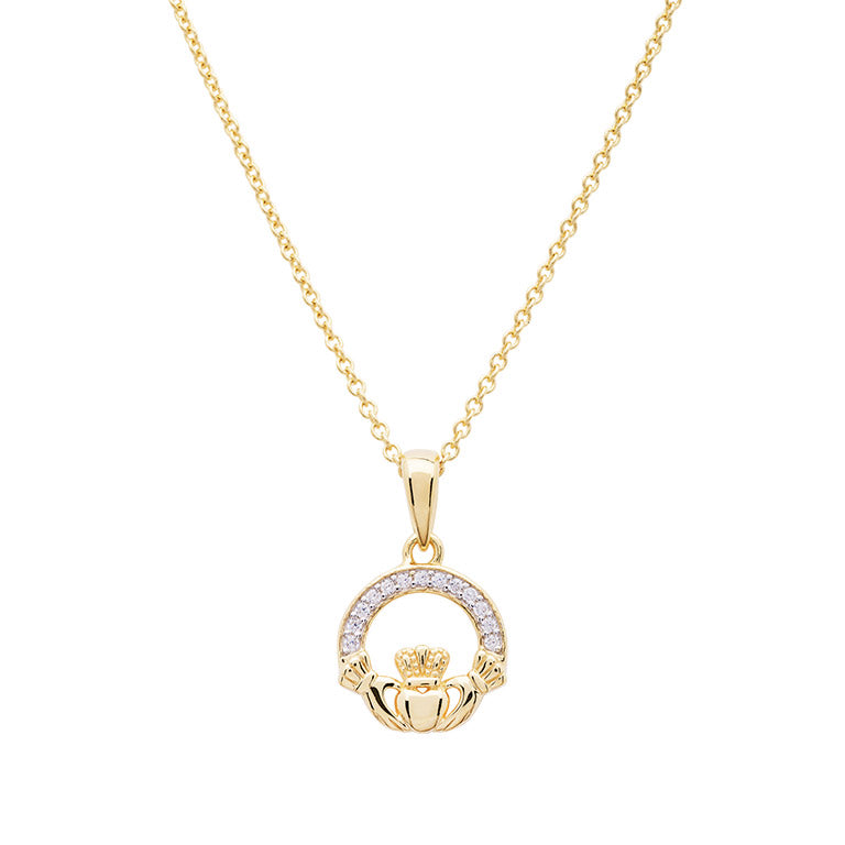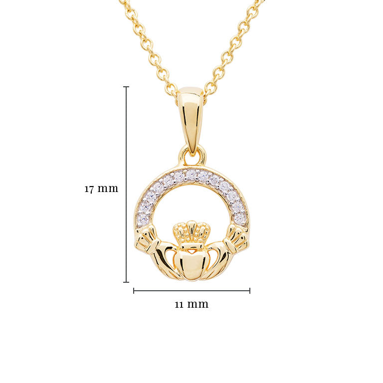 The 14KT Gold Vermeil Claddagh Necklace Studded with White Cubic Zirconias is both a romantic and expressive gift choice. The Claddagh is a beautiful symbol to depict love, loyalty, and friendship. It talks about love and commitment, not just in a romantic relationship, but also in a treasured friendship. This Claddagh necklace makes an ideal gift for birthdays, anniversaries, or any special occasion worthy of the remarkable gift.
