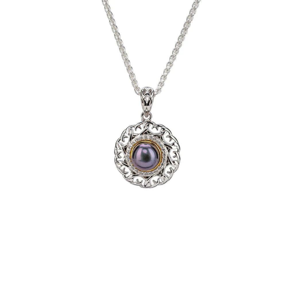 Materials: Rhodium Sterling Silver and 10k Yellow Gold with Peacock Fresh Water Pearl and Cubic Zirconia.