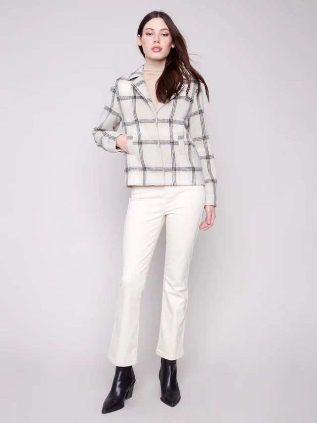 Enjoy the elegance of this plaid short coat. Featuring hidden snap buttons and a cozy wool blend, it perfectly balances style with practicality. The welt pockets add functionality, making it ideal for transitioning between seasons smoothly.