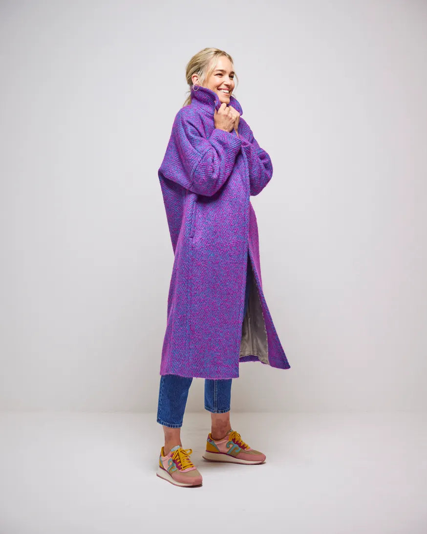 Cocoon in our coveted Light Coat, woven in our wonderful Wicklow mill using a beautifully textured blend of Donegal wool and looped mohair yarns. Cut to a cosy oversized silhouette, the generous collar and lapel frame the unstructured shape while the concealed fastening allows the luxurious fabric to do all the talking. Bring reflective light to your outerwear with this made to be seen purple and blue statement herringbone weave coat.