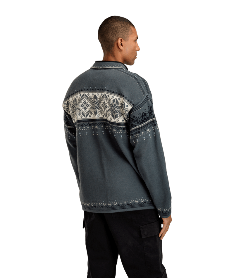 A timeless unisex sweater inspired by traditional Norwegian patterns, with elk leather trim along the zipper.