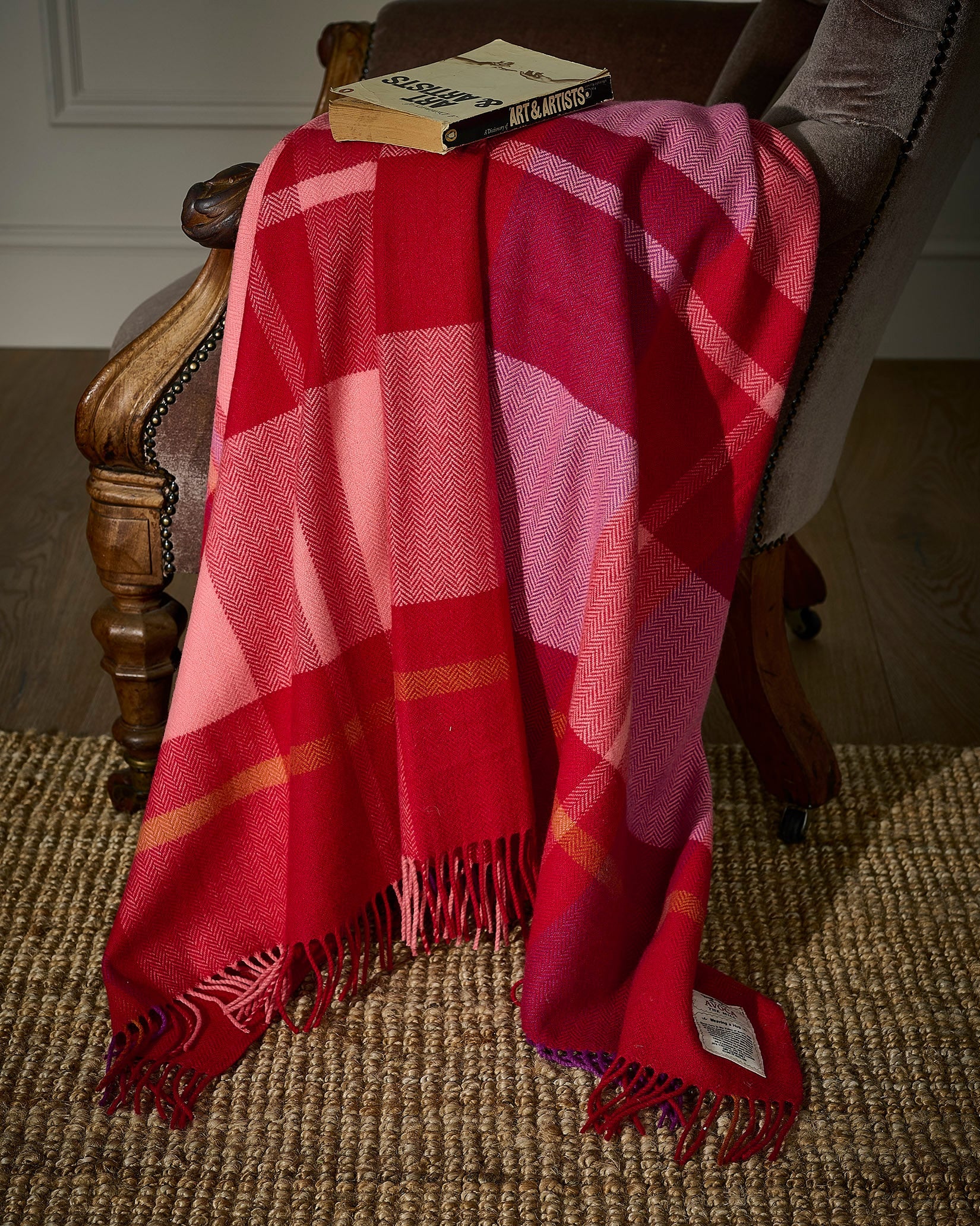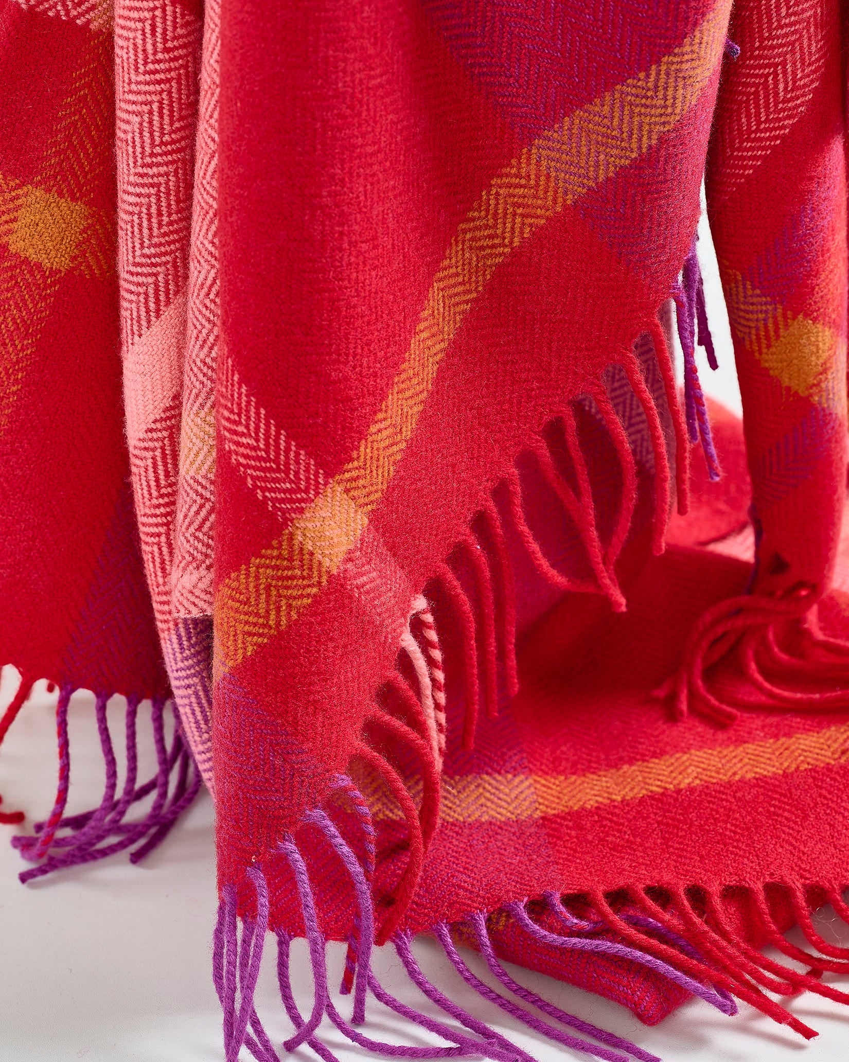 Embrace the vibrant spirit of summer with this luxurious cashmere blend throw, inspired by the rich hues of berry foraging. Featuring a striking check pattern in shades of strawberry red, raspberry pink, and blackberry purple, it brings a lively splash of color to your home. Woven expertly in Ireland’s renowned Avoca Mill, this throw combines softness and durability, finished with delicate fringe detailing for a classic touch. Perfect for adding warmth and style, it elevates any space with its expert craftsmanship and timeless design.