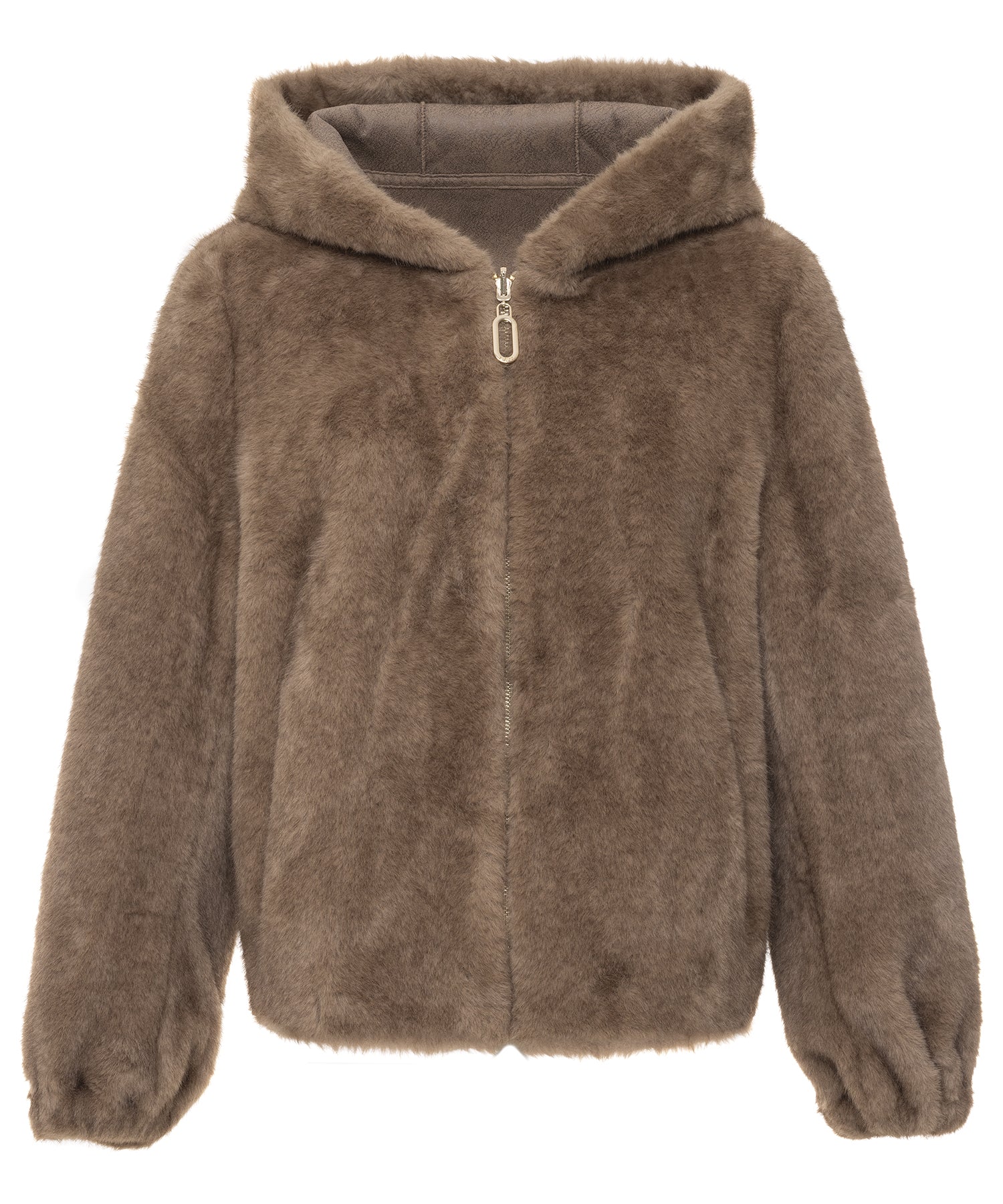 This reversible faux fur hooded bomber delivers two jackets in one. The plush faux fur exterior flips to reveal a sophisticated faux suede lining, offering versatile styling options for any occasion. Features include a functional hood, secure zip fastening with elegant gold hardware, elasticated cuff sleeves for a refined fit, and practical front pockets. Available in neutral tones that complement any wardrobe, this jacket transitions seamlessly from casual to polished looks. The premium soft faux fur and quality construction make it an essential layering piece for year-round wear.