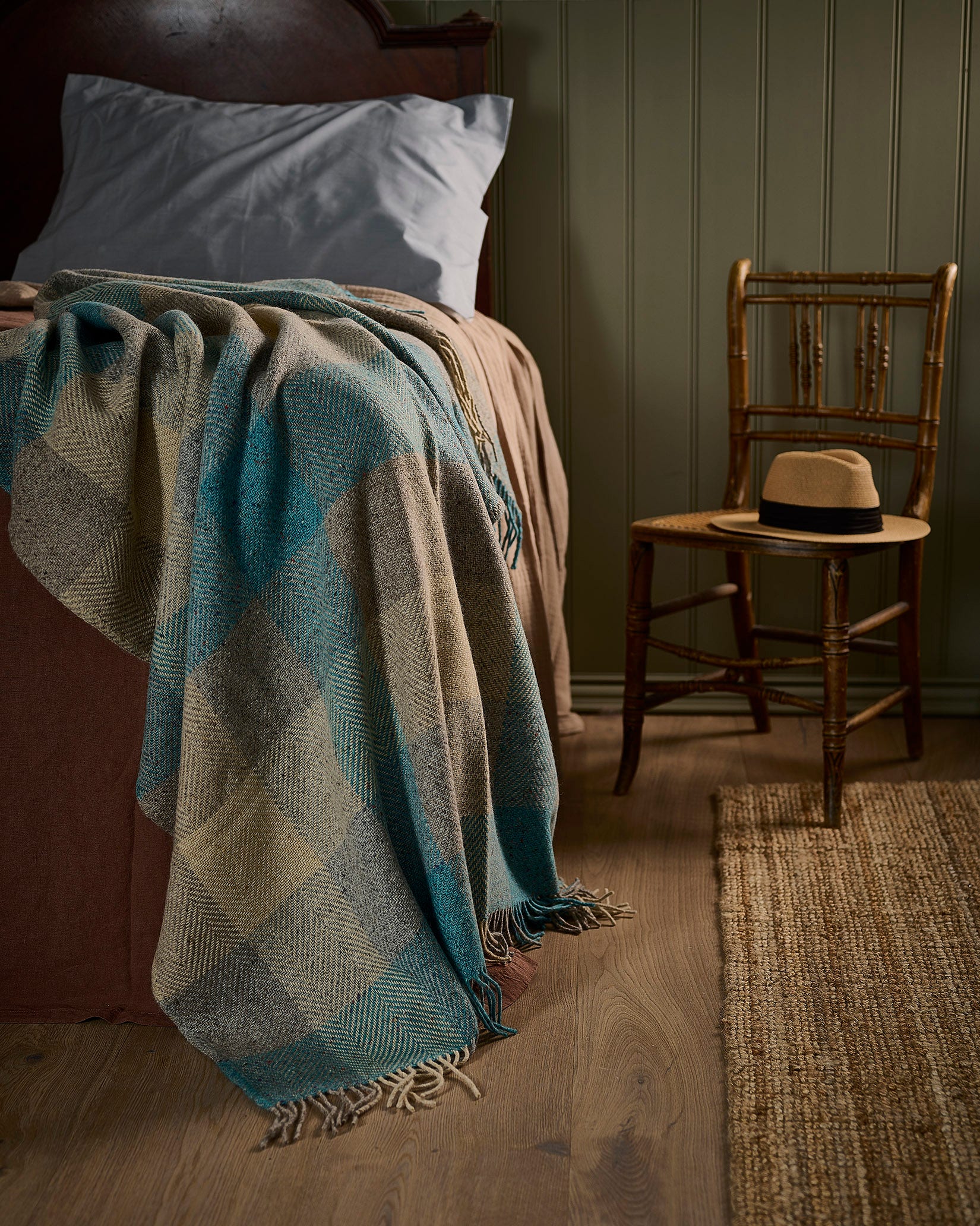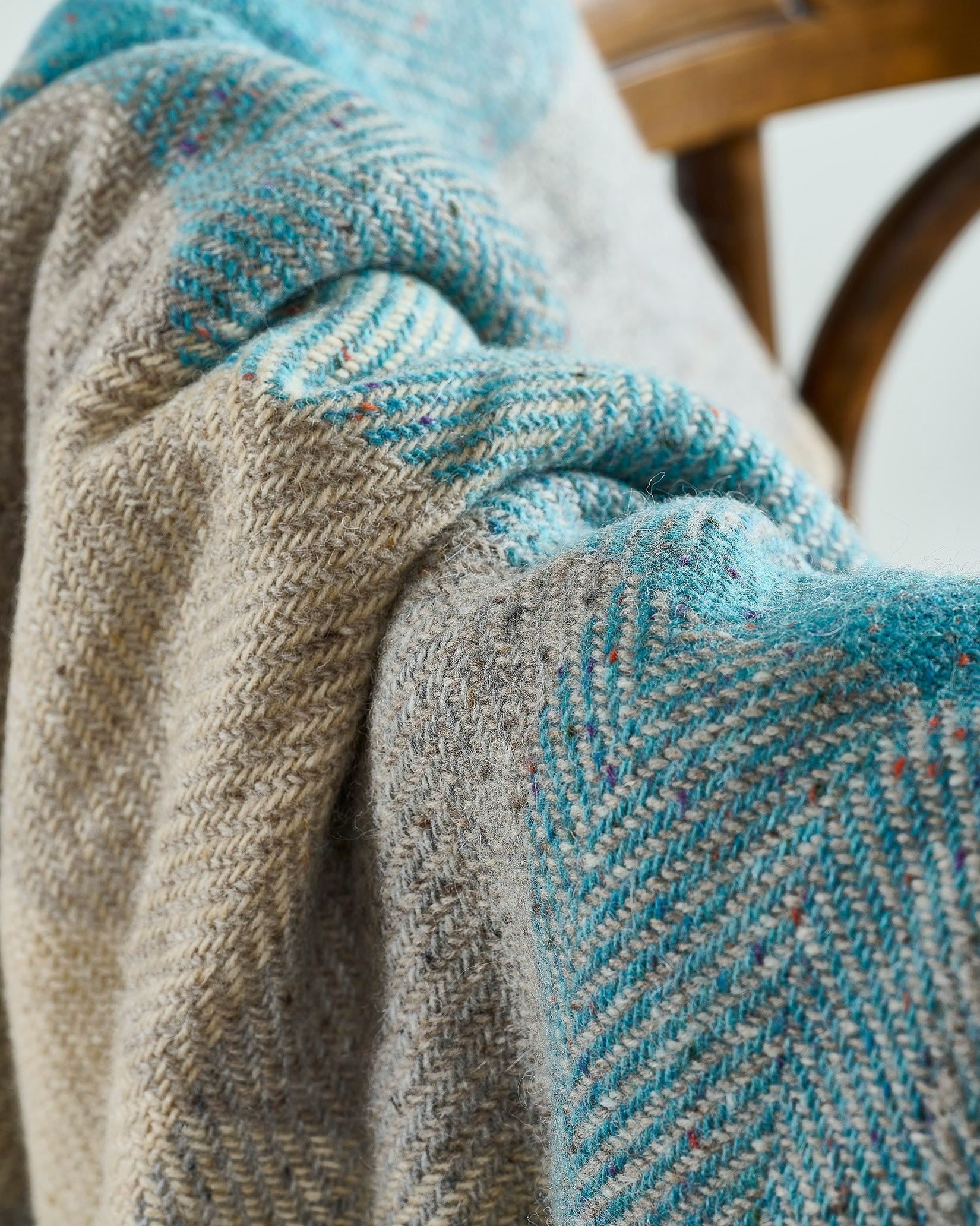 Crafted from a luxurious blend of Donegal wool and mohair, this tweed throw combines softness with timeless heritage. Woven in County Wicklow at Avoca Mill, its delicate mix of creamy beige and vibrant turquoise evokes the freshness of a dewy morning. Ideal for elevating bedroom or living spaces, it offers both warmth and a refined touch of Irish craftsmanship.